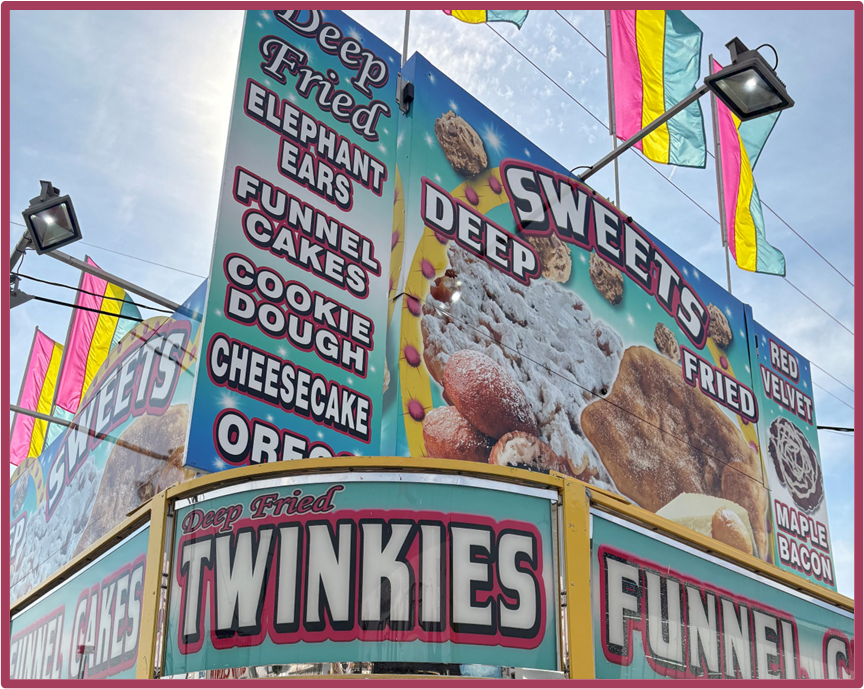 We dined on corndogs and Polish sausages with sauerkraut, but declined the deep-fried delicacies – elephant ears, funnel cakes, cookie dough, cheesecake, Oreos, and Twinkies.